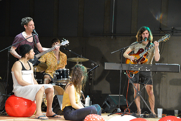 In der Mitte der Bühne befindet sich ein Pool gefüllt mit fünf Aktionstheater Schauspielern im Badeanzug und einer gelben Luftmatratze. Ringsherum auf Klappstühlen und Strandhandtüchern ausgebreitet, die anderen Künstler des Abends. Im Foyer vor Beginn der Vorstellung ruft Regisseur Martin Gruber dazu auf, jeder solle sich einen Drink holen und diesen mit in den Saal nehmen, schließlich handle es sich nicht um eine Theateraufführung. Das Publikum sitzt also mit Spritzer und Makava in der Hand da, als Gruber beginnt am Bühnenrand laute Lyrik zu schmettern.