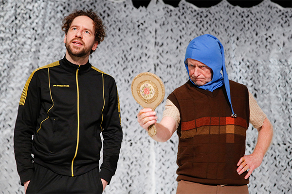 Auf der einen Seite haben wir Klaus Huhle, welcher auf fabelhafte Weise einen treuherzlichen und kindlich naiven Parzival gibt. Auf der anderen Seite sehen wir Sven Kaschte, welchen wir nicht nur für seine überragend komische Darstellung von Mudder loben können, sondern auch für die vielen anderen Rollen, in die er im Verlauf des Stückes schlüpft. Dazu gehört unter anderem König Artus, der rote Ritter, und Anfortas, der Hüter des Grals. Allen voran steht er aber als Ritter Gawan auf der Bühne, welcher versucht, durch unzählige Regeln für Ritter, aus dem naiven Parzival einen knallharten Ritter zu machen (und auch modisch hält er einige Tipps parat).