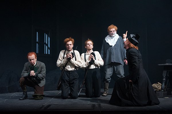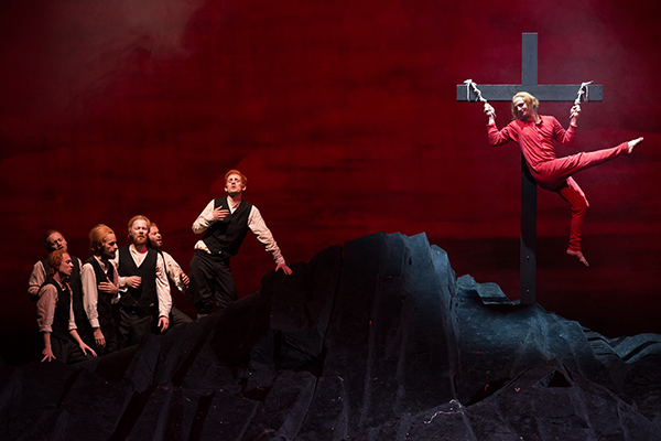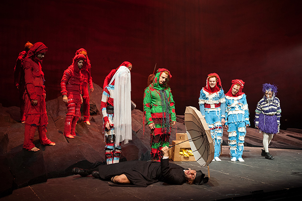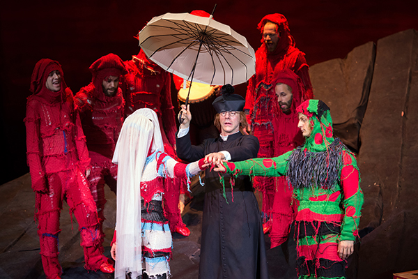 Dann bricht es los, das Gewitter, und mit ihm die Komödie, die so richtig keine ist. Eher ein buntes Chaos, ein Streifzug durch eine absurde Szenerie. Heiße subtropische Savanne in den sonst hohen, kalten Bergen. Doch kann damit jeder umgehen? Ist dieses wilde Treiben, dass das Dorf in Aufruhr versetzt, vielleicht sogar der Anfang vom Ende? Oder ist es nur die Angst vom unbekannten Fremden, vom Neuen? Für den Kaplan Wolkenflug (Markus Meyer) ist die Lage klar, es muss was unternommen werden gegen das heidnische Treiben, und so spitzt sich ein Konflikt zu zwischen den Befürwortern und Jüngern des Florian, dem sein Erfolg zu Kopf steigen droht und dem konservativen Wolkenflug. Zwischen den Polen finden sich eine Handvoll Charaktere, die die Situation, nach ihrem eigenen Vorteil bewerten, wie der Kolonialhändler Kuckuck (Peter Matic) oder der Bürgermeister (Falk Rockstroh), die jeweils das große Geschäft wittern. Hinter dem Chaos und der Absurdität steht aber ein sattelfestes Gerüst. Eine Geschichte, die einen Bogen spannt und uns von Menschen und Gesellschaft erzählt, Fragen aufwirft, Antworten in Aussicht stellt.