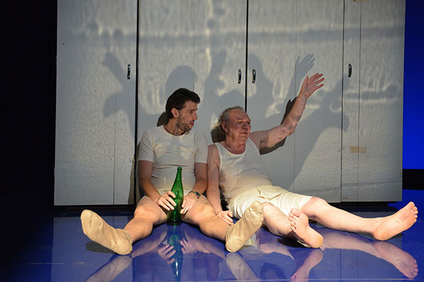 Eine blaue Insel in schwarz-glänzendem undurchsichtigen Gewässern, eingetaucht in weißes, kaltes Licht. Darauf ein Schrank, zwei Stühle, ein Nachttisch und elementar: ein Telefon. Direkter Kontakt geht ja eigentlich gar nicht. Nur, wenn nicht anders möglich oder beim Versuch gute alte Zeiten wieder aufleben zu lassen, beim Bier am See zum Beispiel oder wenn ein Bürge für die Bank gesucht wird. So agiert jedenfalls der Hauptprotagonist. Doch dann hat er plötzlich seinen Vater zu pflegen, der, der niemals seine Kinder geschlagen hat. Nicht den asthmakranken jüngeren Sohn, nicht den egozentrischen, bindungsunfähigen Älteren.