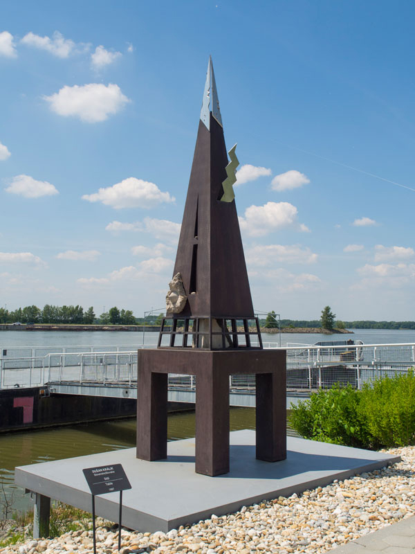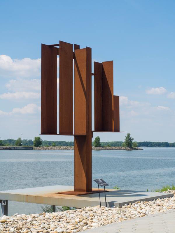 An der Museumsreling lehnen, den Blick übers Wasser schweifen lassen, Seite an Seite mit zeitgenössischer Kunst. Das Danubiana Meulensteen Art Museum ist ein Ort zum Seele-baumeln-Lassen. Konzipiert wie ein Schiff, gelegen im Dreiländereck auf einer einsamen Halbinsel in der Donau, nächst dem Wasserkraftwerk Vodné dielo ˇCunovo, 20 Minuten von Bratislavas Zentrum, eine Stunde von Wien, reiht sich das Danubiana in die Liste jener Museen, die man schon allein ihrer Architektur willen sehr gerne besucht. Besonders in den Sommermonaten ist das Danubiana ein einziger Genuss. Ist wegen des weitläufigen Skulpturenparks (und der Liegestühle mittendrin) ein Besuch bei Sonnenschein vorzuziehen, so hat das Museum mit den gläsernen Fassaden vermutlich auch bei Regenwetter seinen Reiz. Das Wetter, das Tageslicht, die Natur, die Donau - all das ist Teil des Konzepts. Gebaut hat es der Architekt Peter Zalman im Jahr 2000, die Schiffsform erinnert an eine römische Galeere, inspiriert vom Limes, der einst durch den Ort ˇCunovo geführt hat. Achttausend Quadratmeter misst die längliche Halbinsel, auf der die Sammlung Danubiana und die Sammlung Meulensteen zu sehen sind. Diese vereinen ausschließlich moderne und zeitgenössische Werke und legen die Schwerpunkte auf internationale, niederländische und slowakische Kunst.